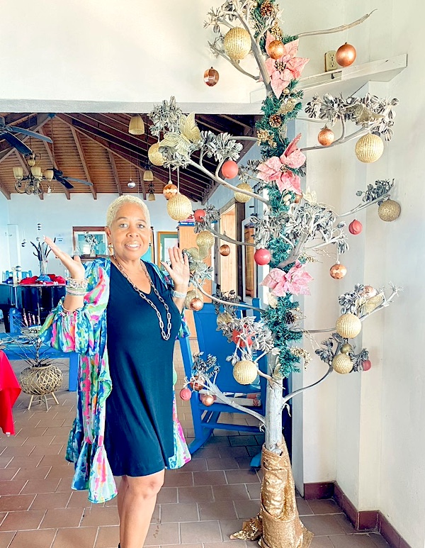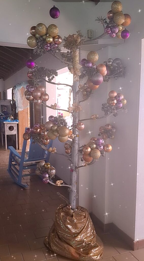 She used a beautiful century plant, tall and dramatic, its natural silhouette already a sculpture. She decorated it with tinsel, lights, and island flair, turning it into something unforgettable.